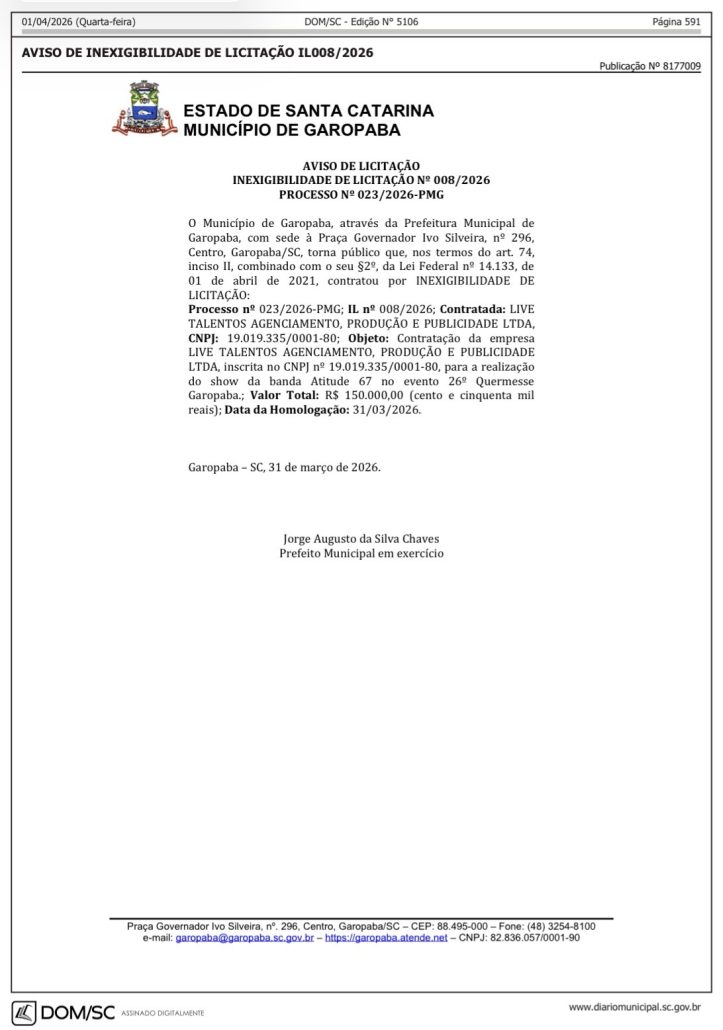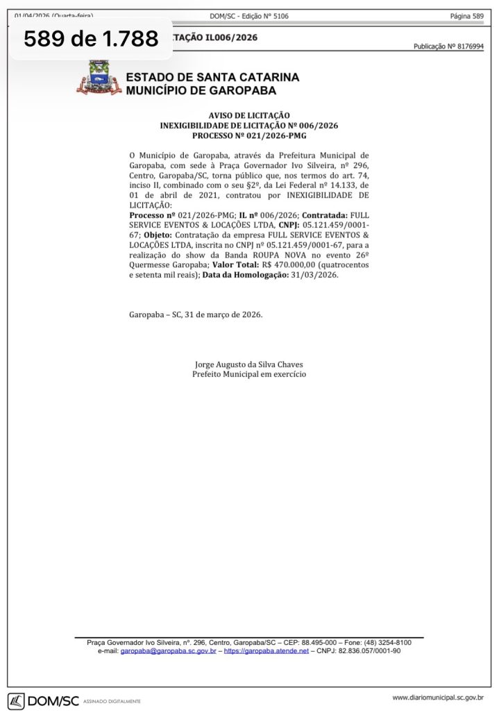 Os artistas contratados vão custar quase 1,4 milhão aos cofres públicos do município. O artista mais bem pago da lista é Alexandre Pires (confira abaixo os valores dos cachês).