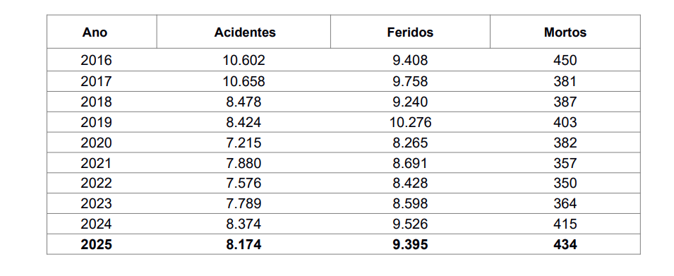 Em comparação com 2024, houve uma redução de 2,4% no total de acidentes e de 1,4% no número de feridos, mas um aumento de 4,5% no número de mortos.