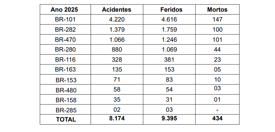 A Polícia Rodoviária Federal (PRF) registrou em 2025 um total de 8.174 acidentes nas rodovias federais de Santa Catarina, deixando 9.395 pessoas feridas e 434 mortos no local das ocorrências. A BR-101 foi a via com maior número de casos, seguida pela BR-282 e BR-470. O balanço das ações do ano passado foi divulgado pela corporação nesta sexta-feira (16).