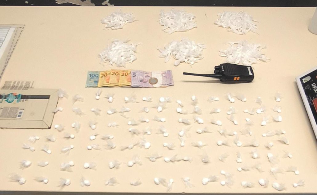 Nos bolsos do casaco do adolescente foram encontrados 275 pedras de crack, 107 petecas de cocaína, R$ 166 em dinheiro e um rádio comunicador. A PM ainda constatou que havia um mandado de busca e apreensão ativo contra ele.