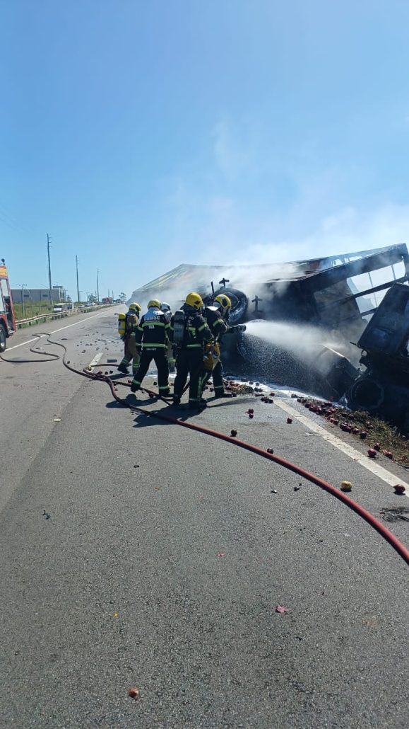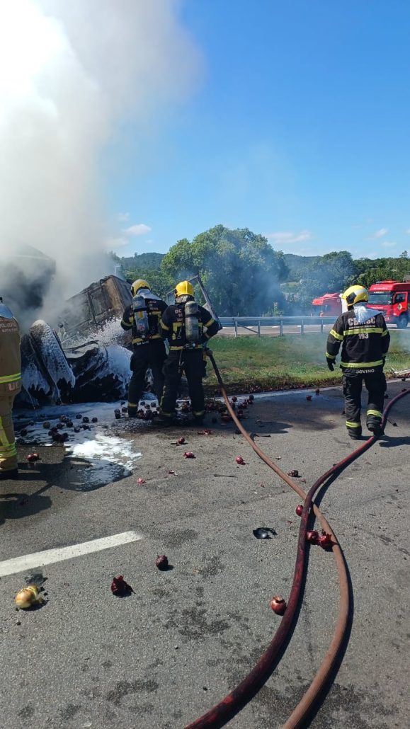 Um incêndio de grandes proporções atingiu uma carreta que transportava carga de cebola na tarde desta quarta-feira (17), na BR-101, no trecho do Morro Azul, em Jaguaruna, no Sul de Santa Catarina. A ocorrência foi registrada por volta das 14h24.