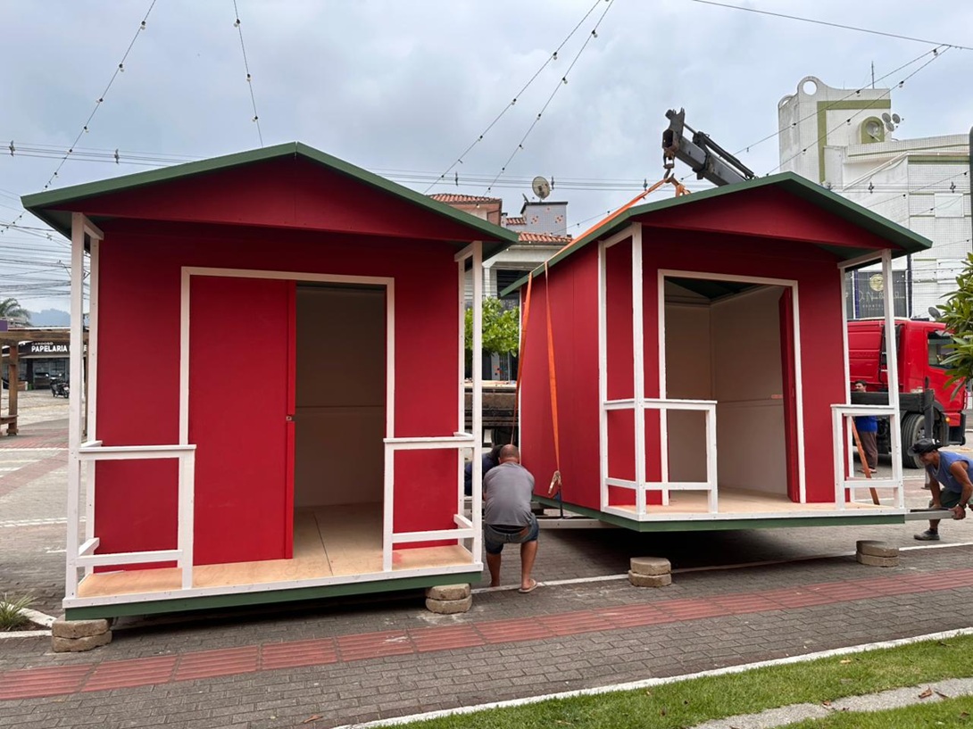 As primeiras casas da Alameda Comercial da Vila de Natal começaram a ser instaladas nesta segunda-feira (03), marcando o início da montagem do cenário que encantará moradores e visitantes de Gravatal, no Sul de Santa Catarina.