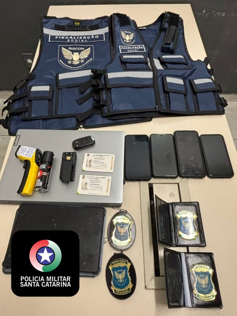 Durante a ação policial, um dos suspeitos vestia colete com a inscrição “fiscalização”. No veículo e com os abordados, foram encontrados diversos itens que simulavam a função de agentes públicos: distintivos, carteiras funcionais, câmera corporal, spray de pimenta, computadores, celulares, tablet e até um equipamento de verificação de combustíveis.