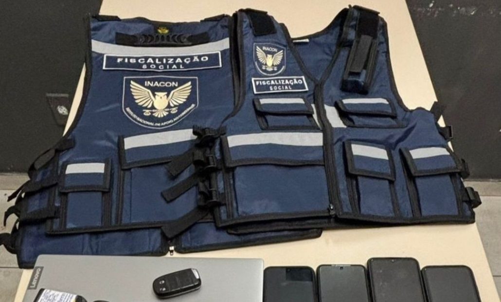 Durante a ação policial, um dos suspeitos vestia colete com a inscrição “fiscalização”. No veículo e com os abordados, foram encontrados diversos itens que simulavam a função de agentes públicos: distintivos, carteiras funcionais, câmera corporal, spray de pimenta, computadores, celulares, tablet e até um equipamento de verificação de combustíveis.