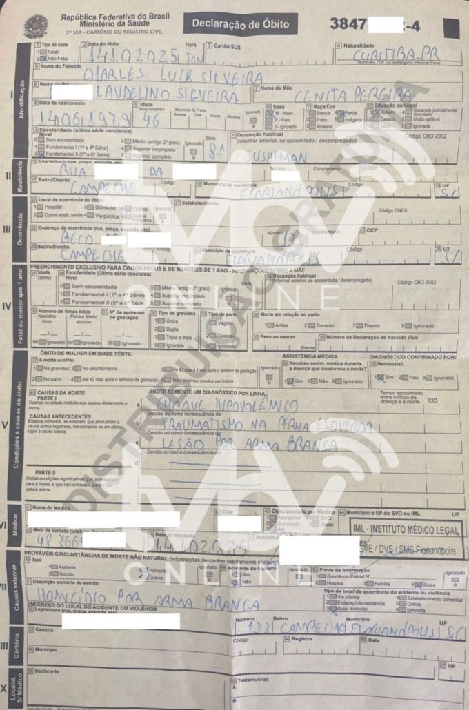 No entanto, a certidão de óbito indicou que ele sofreu traumatismo na perna esquerda e uma lesão por arma branca, causada por faca, contrariando a versão inicial apresentada às autoridades.