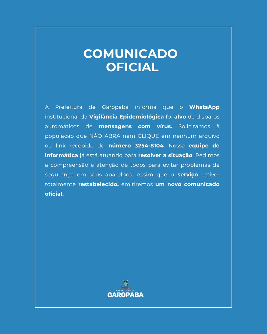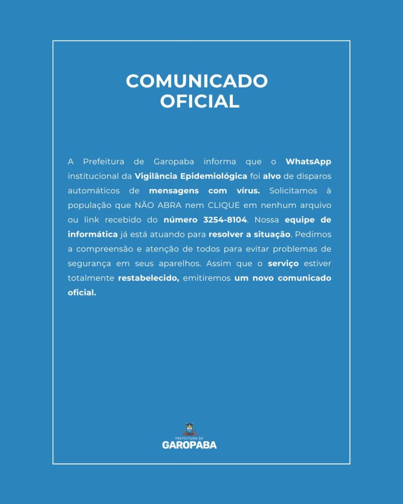 A Prefeitura de Garopaba informou nesta sexta-feira (3) que o WhatsApp institucional da Vigilância Epidemiológica foi alvo de disparos automáticos de mensagens com vírus.