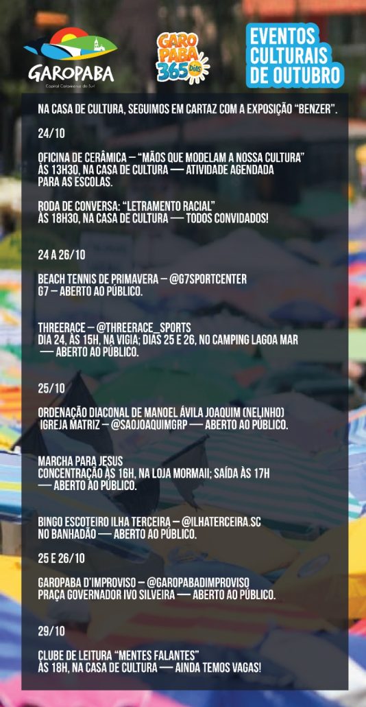 Garopaba, no Sul de Santa Catarina, segue com uma programação cultural intensa neste mês de outubro, com atividades para todas as idades. Na Casa de Cultura, continua em cartaz a exposição “Benzer”, que pode ser visitada pelo público durante o horário de funcionamento.