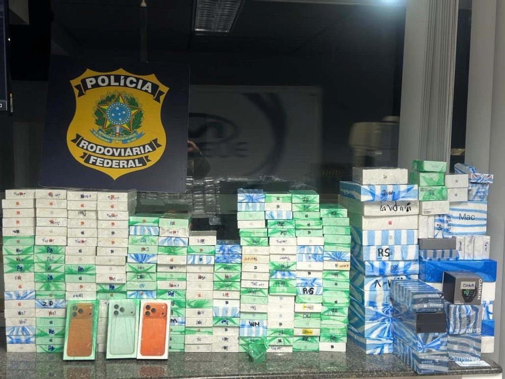 Durante a vistoria no carro, os policiais encontraram mochilas repletas de aparelhos eletrônicos de alto valor comercial, a maioria da marca Apple, sem embalagens originais. Ao todo, foram apreendidos 789 celulares — entre eles modelos recentes como o iPhone 17 Pro Max — além de 86 itens de informática e fotografia, incluindo MacBooks, iPads, relógios inteligentes e lentes profissionais.
