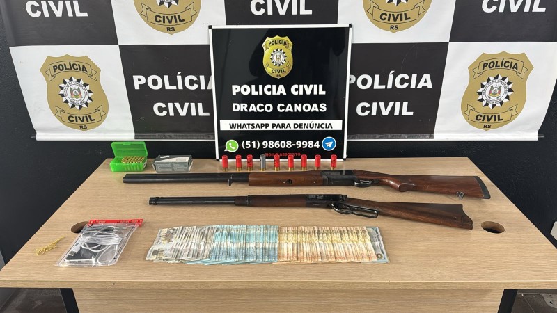 Na casa de um dos alvos, a polícia encontrou duas espingardas calibres 12 e 38, sem registro legal, além de munições. Segundo o delegado Gustavo Bermudes, as armas haviam sido furtadas em 2022 e 2024, nas cidades de Taquara e Novo Hamburgo. Um homem foi preso em flagrante no local.