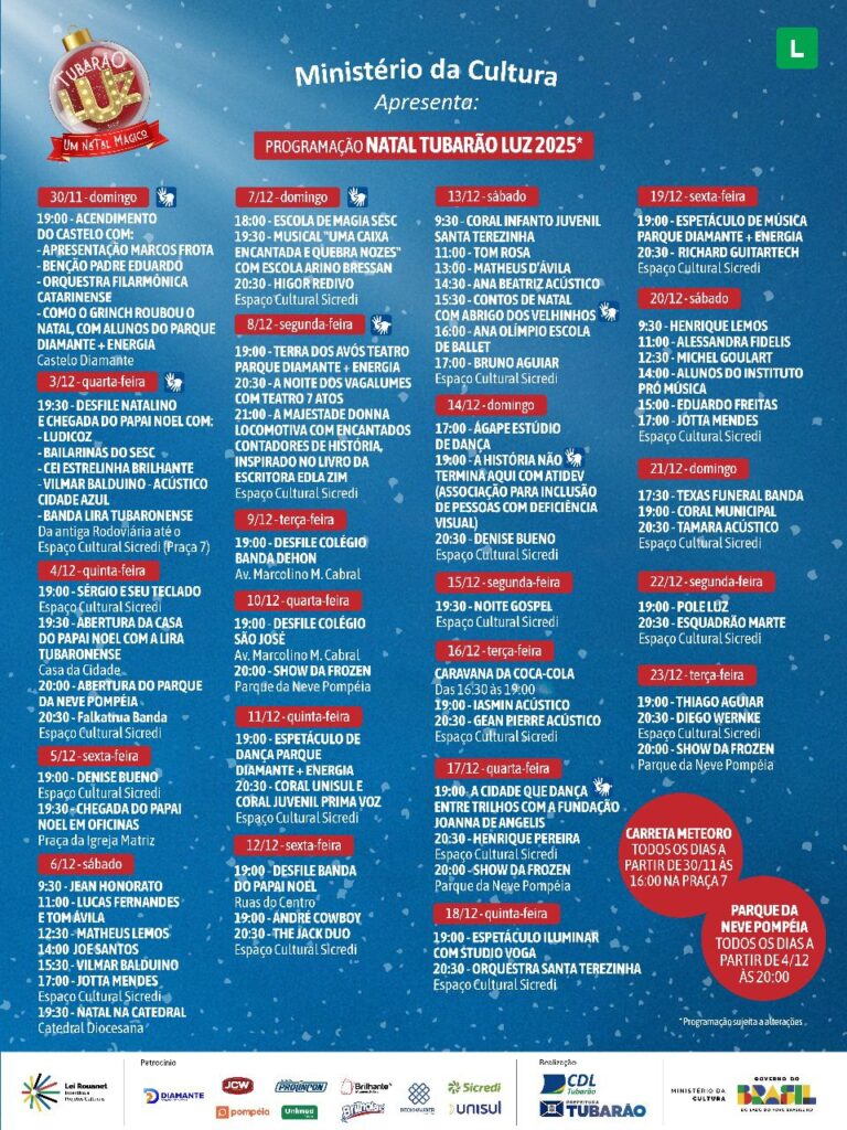 O Natal Tubarão Luz 2025 é realizado pelo CDL Tubarão, com apoio da Fundação Municipal de Cultura e da Prefeitura de Tubarão.