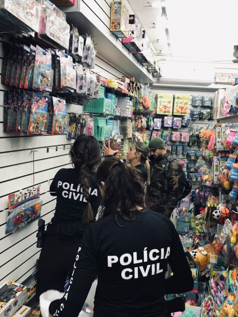 Cinco estabelecimentos comerciais de Porto Alegre foram vistoriados, resultando na apreensão de 680 kg de mercadorias falsificadas e na prisão de cinco pessoas pelos crimes de contrabando e contra as relações de consumo. De acordo com a corporação, a principal irregularidade encontrada foi a comercialização de brinquedos sem as especificações técnicas exigidas por órgãos reguladores.