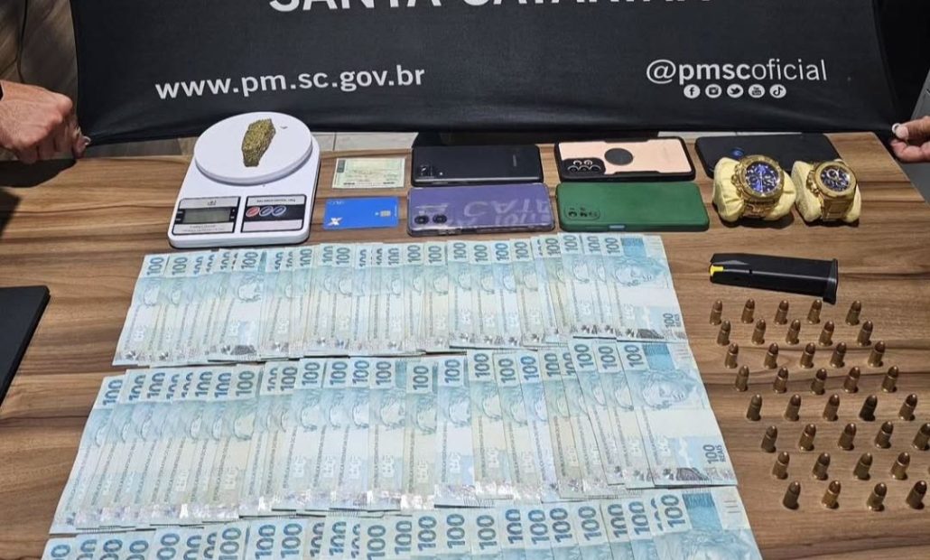 No interior da residência, os policiais também localizaram a mulher. Durante as buscas no local, foram apreendidos cerca de 20 gramas de maconha, aparelhos celulares, dinheiro, aproximadamente 40 munições de calibre 9 milímetros, um carregador de arma de fogo, uma balança de precisão, relógios e outros objetos cuja procedência será apurada.