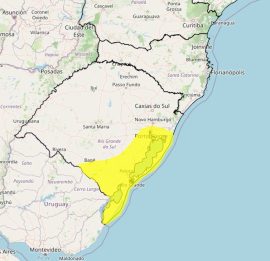 O Instituto Nacional de Meteorologia (Inmet) publicou um aviso meteorológico amarelo, que indica perigo potencial, para o risco de vendaval no Rio Grande do Sul nesta sexta-feira (17). Estão previstos ventos entre 40 e 60km/h. O aviso irá vigorar das 9h às 22h.