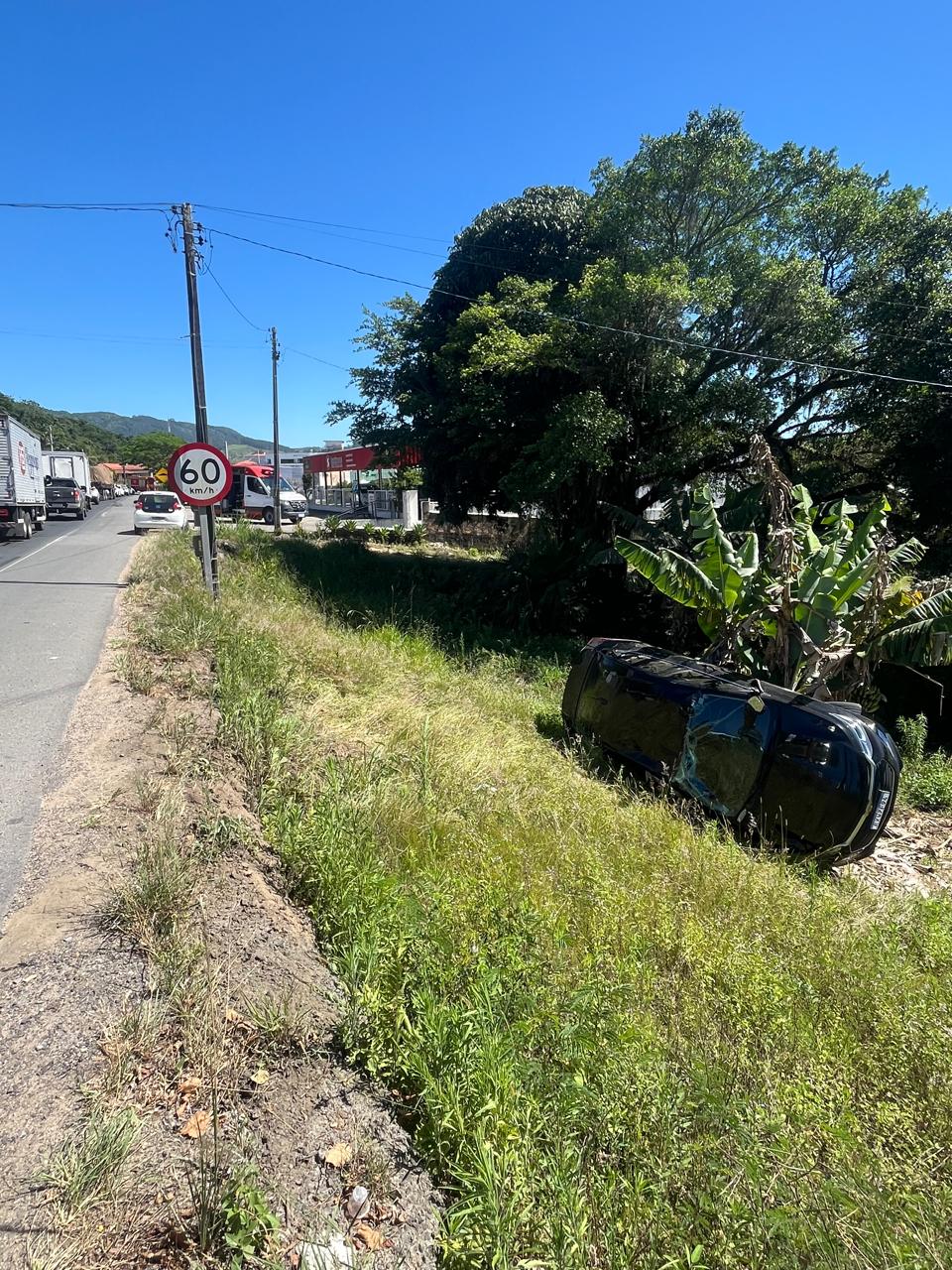 Entre os veículos envolvidos estava um Chevrolet Onix, que saiu da pista e ficou lateralizado em um barranco, apoiado sobre o lado do passageiro. O condutor, um homem maior de idade, estava fora do veículo, consciente e orientado. Ele foi atendido pelo Samu, mas recusou encaminhamento ao hospital.