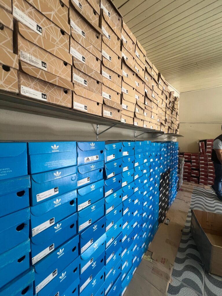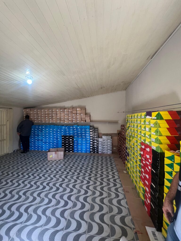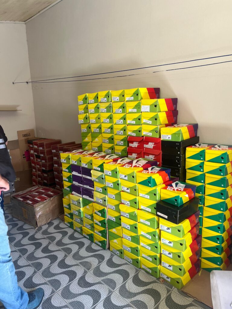 A ação cumpriu um mandado de busca e apreensão expedido pelo Poder Judiciário. O alvo foi uma residência localizada no bairro Recife, onde o investigado armazenava tênis de marcas renomadas com indícios de falsificação.