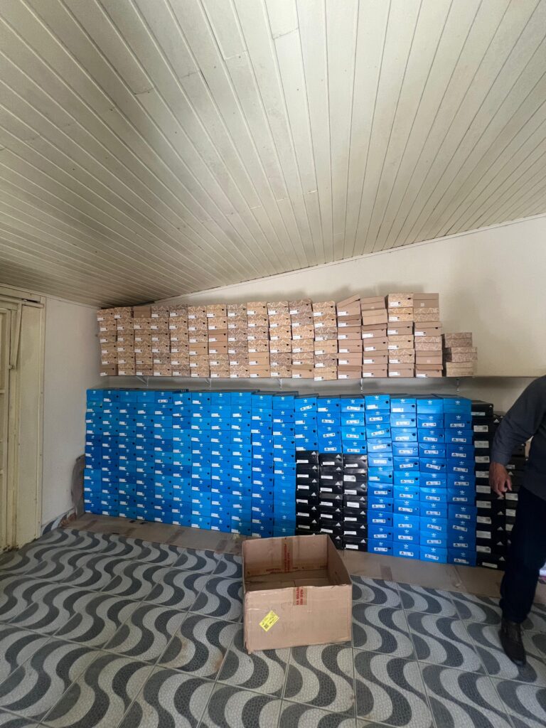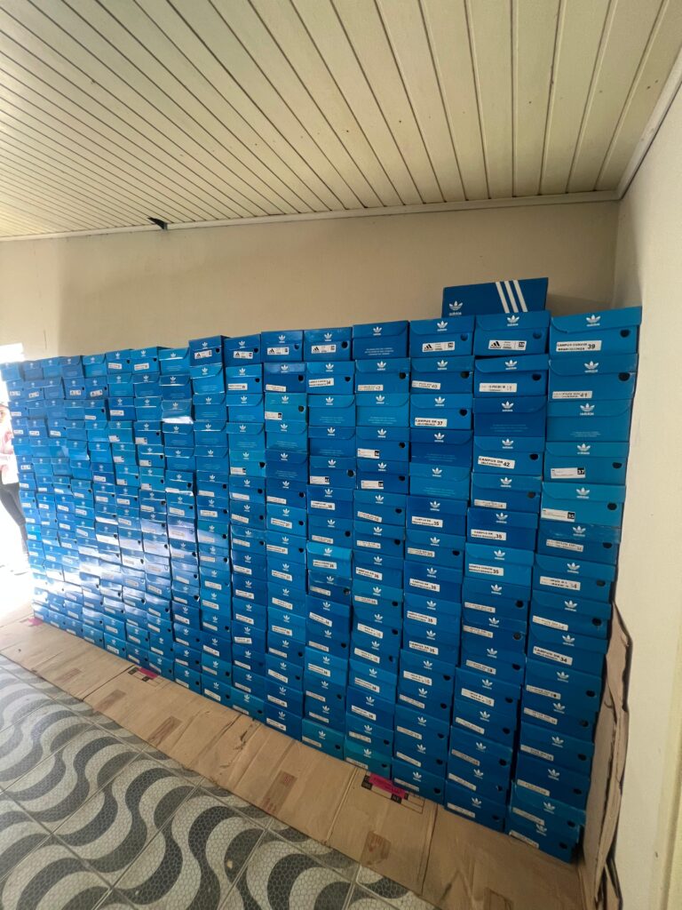 De acordo com as autoridades, os produtos eram vendidos pelas redes sociais com entrega em domicílio. Ao todo, mais de 800 pares de tênis falsificados, com logotipos de marcas como Nike e Adidas, foram apreendidos no local.